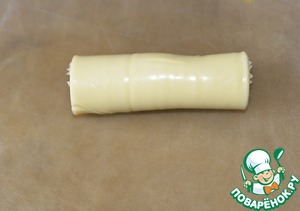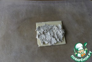 Наносим муссовую массу на пластинку сыра, оставляя с краю пустое место.