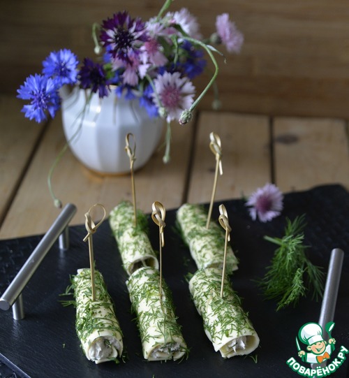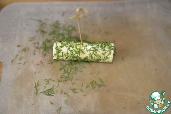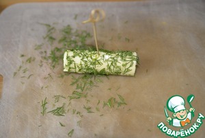 "Прокатываем" по рубленному укропу, вставляем шпажку.