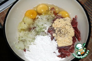 Добавить к мясу яйца, майонез, крахмал, соль, перец и мелко нарезанный лук.Всё перемешать и поставить на 5-6 часов в холодильник мариноваться.Можно и на целую ночь,чем больше оно маринуется,тем мягче мясо.