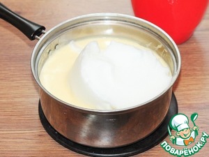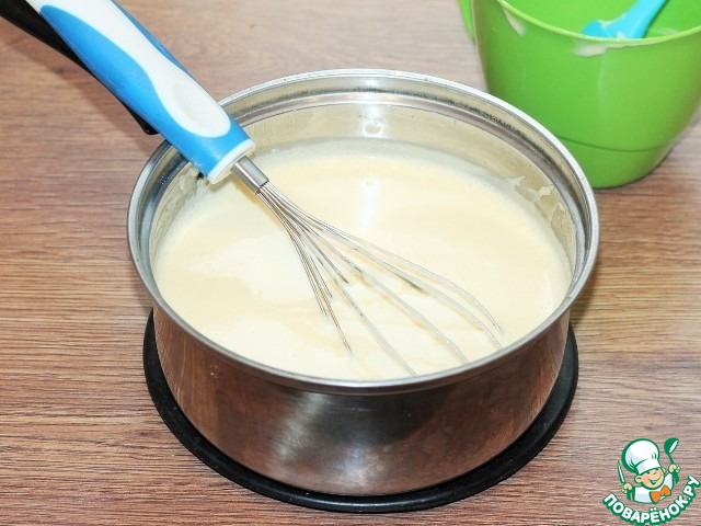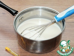 6. Желтки постепенно вмешать в горячую молочную смесь, быстро перемешивая и не допуская сворачивания.