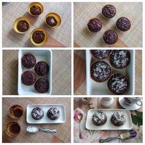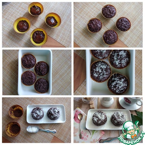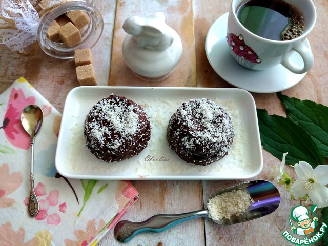 Я сделаю немного по-другому и подам к чашечке кофе в качестве десерта, который можно есть ложечкой. Выложила массу в силиконовые формочки. Я проложу массу абрикосовым джемом. Этого можно не делать, но сейчас сезон абрикосов и я сделала немного своего джема и просто захотелось его использовать. Я в каждую формочку положила посередине шоколадной массы по 1 ч л. У меня получилось 4 шт форм с десертом. Я хочу быстро охладить десерт и помещу его примерно на час в морозильник перед подачей. Поместила формочки в посуду подходящую, присыпала кокосовой стружкой. Это для того, чтобы когда я извлеку десерт из формочек, я его переверну на сторону с кокосовой стружкой. Поставила в морозильник на 1 час. Через 40 минут проверила, отходит ли масса от стенок формы легко. Мне понадобился час. Десерт совершенно не замёрзнет. Он просто станет плотней. Для подачи я выложила десерт в посуду и щедро посыпала его кокосовой стружкой. Сварила к нему кофе.