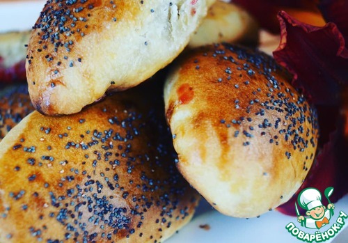 • Сформировать пирожки и уложить их на смазанный противень или сковороду, швом вниз. Яичный желток развести столовой ложкой воды, смазать верх пирожков, и посыпать по желанию маком. Дать пирожкам расстояться минут 15.