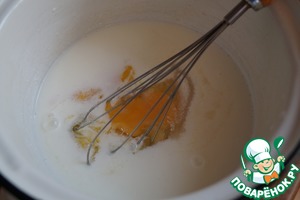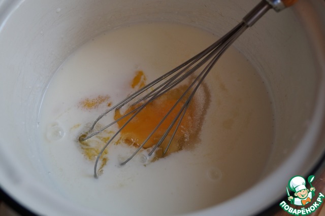 • В остальной кефир добавить сахар, соль, яйцо и кефир с дрожжами.
