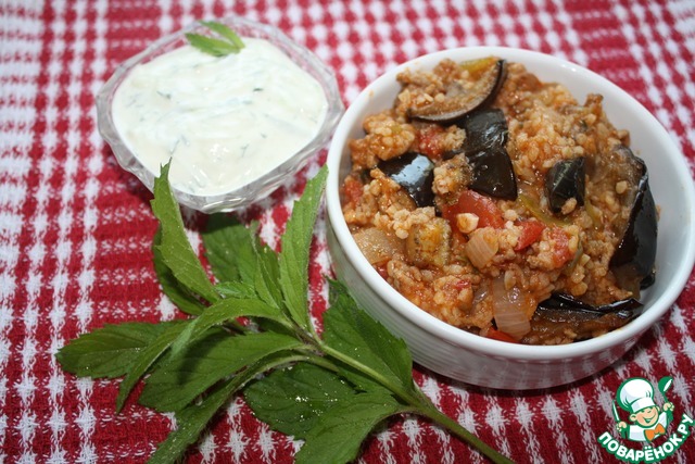 Затем добавляем баклажаны и булгур. Доливаем воды около 150 мл, солим по вкусу.