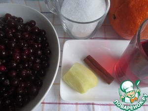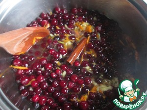 Клюкву поместить в кастрюлю, добавить имбирь, сахар, цедру, апельсиновый сок, красное вино и палочку корицы.
