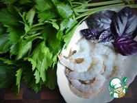 Вымыть и обсушить зелень сельдерея, листья базилика. Креветки почистить. |
