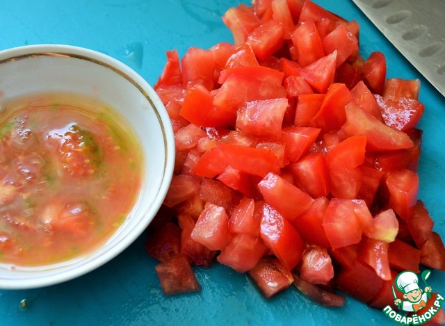 Помидор нарезать мелким кубиком, удалив семена. Добавить к сельдерею. |