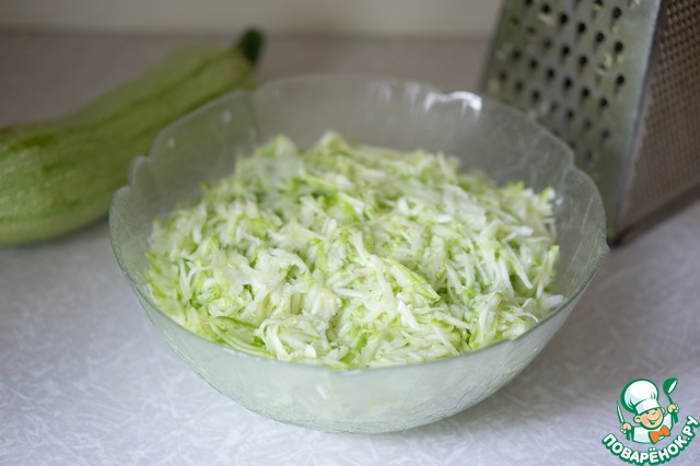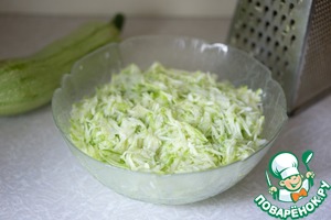 Молодые кабачки натрите на крупной тёрке. Посолите, перемешайте и оставьте на 15 минут, чтобы выделился сок.