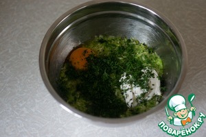 Отожмите кабачки от сока. Добавьте нарезанную зелень, яйца, сметану и перец. Перемешайте.