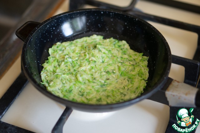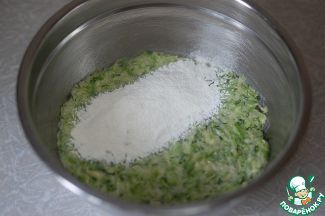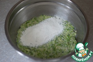 Добавьте муку, перемешайте. Муки может понадобиться чуть больше или меньше в зависимости от сочности кабачков.