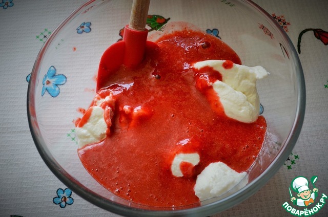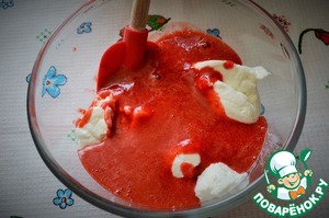 В йогурт добавить клубничное пюре, перемешать или взбить.