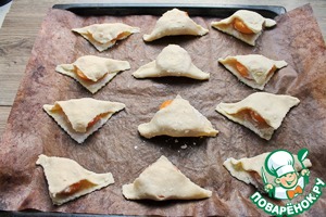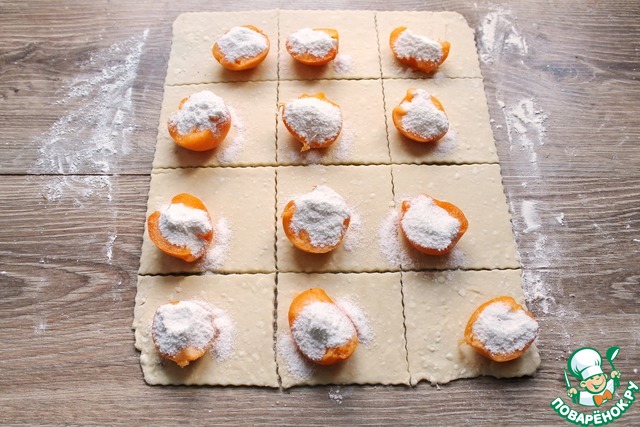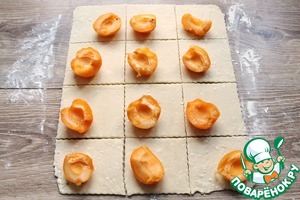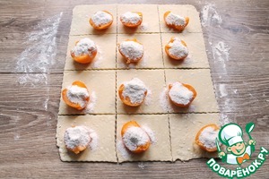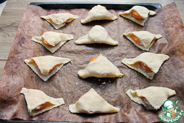 Закрываем противоположным уголком теста и прижимаем уголки и тесто к абрикосу. Конечно. можно защипать края, но у меня абрикосы были большие, поэтому я не стала. Время приготовления не большое и крахмал не даст соку много вытечь.