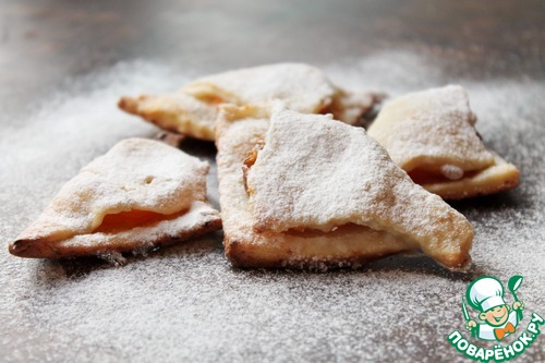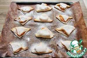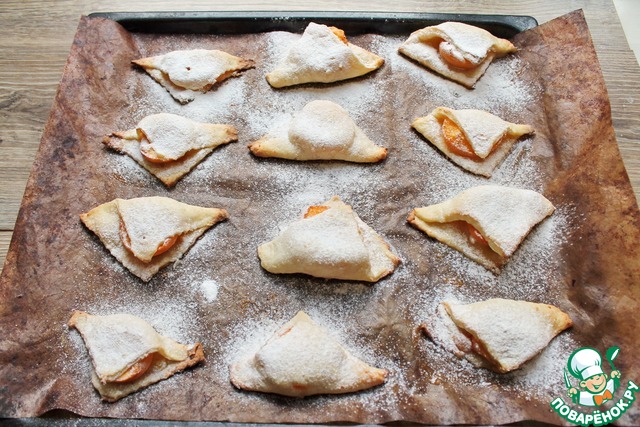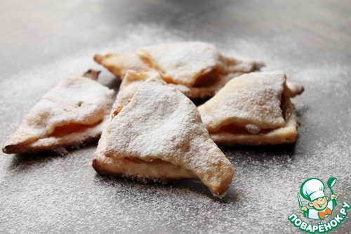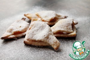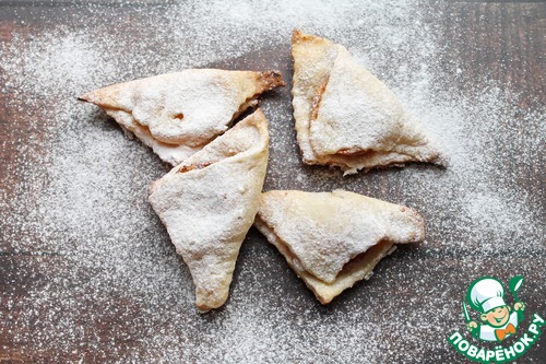 Остывшие треугольники хорошенько обсыпаем сахарной пудрой. Конечно, можно этого и не делать, но тогда они получатся кисловаты.
