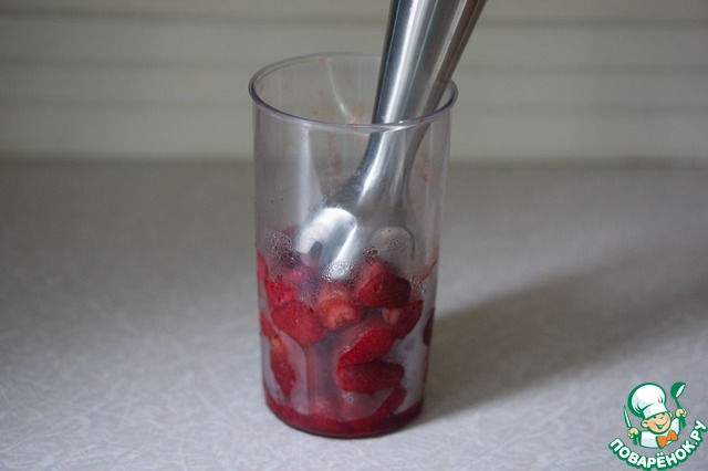 Клубничный конфитюр разомните ложкой или пробейте блендером до однородного состояния. Разровняйте по поверхности теста.