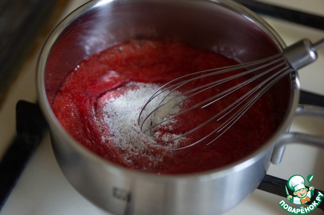 Всыпьте сахар с пектином в ягодное пюре, непрерывно размешивая венчиком. Проварите на среднем огне 2 минуты.