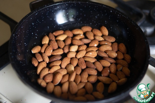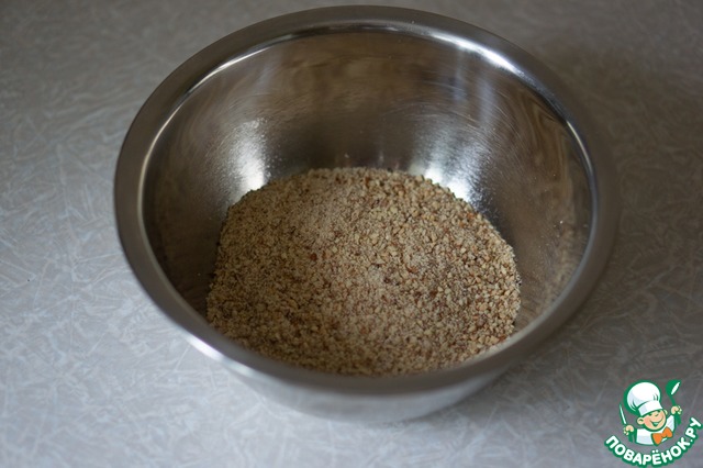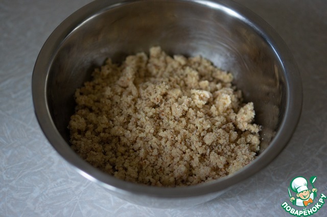 Смешайте измельчённый миндаль, сахар и муку. Добавьте нарезанное кубиками сливочное масло. Разотрите руками в крошку. Поставьте в холодильник до использования.