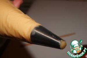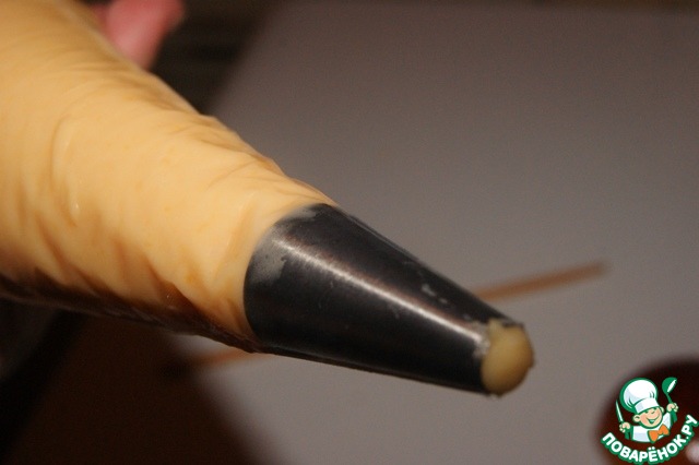 С помощью китайской палочки для еды, сделать в булочке (сбоку) отверстие. Проколоть почти до конца и осторожно вращая внутри по кругу, таким образом сделать место для крема.