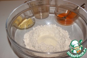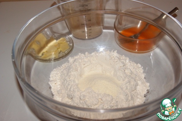 Дрожжи развести в воде. Желток 1 взбить вилкой. Муку, сахар, соль, ваниль и сухое молоко перемешать. -