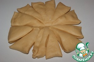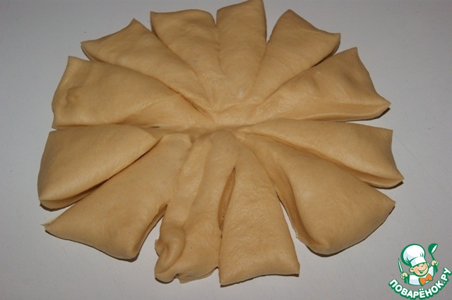 Подошедшее тесто обмять и расправить в круг 20 см в диаметре. Нарезать на 12 сегментов.