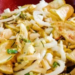 В салатник выложить лук нарезанный тонкими кольцами и яйца нарезанные средним кубиком. Добавить остывший кабачок.