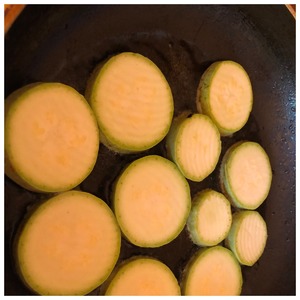 Кабачок помыть и нарезать кружочками. Обжарить на растительном масле с двух сторон.