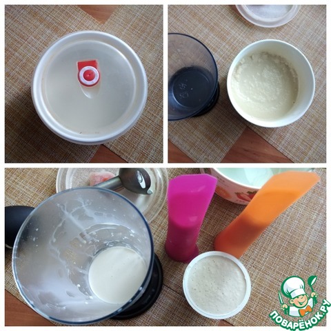 Накрываем крышкой и ставим в морозильную камеру на 2 часа. За это время масса почти схватится. Перекладываем её в чашу блендера и взбиваем минуты 3-5. Раскладываем по формам. У меня получилось 3 шт мороженого. Две формы силиконовые и один одноразовый стаканчик для кофе. Убираем опять в холодильник, лучше на ночь, что я и сделала.