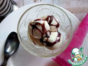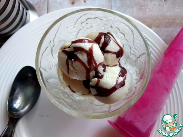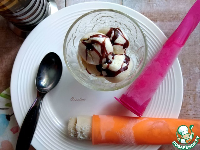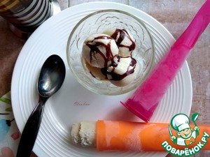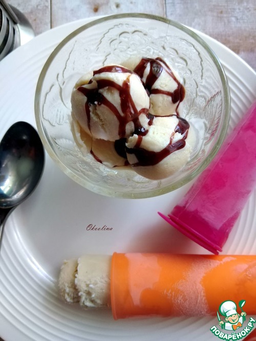 Мороженое полностью стабилизировалось. Достаём из холодильника и едим. Мороженое, которое я сделала в стаканчике, я выложила ложкой для мороженого в креманку и полила его растопленным молочным шоколадом. Мороженое, которое у меня в силиконовых формах, вынимать не требуется. В этих формах его едят выдавливая.