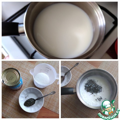 Накрываем крышкой и даём чаю в молоке завариться. Содержимое кастрюльки должно полностью остыть. Процеживаем молоко в посуду, в которой будем делать мороженое. Выкладываем сгущённое молоко. Тщательно соединяем.