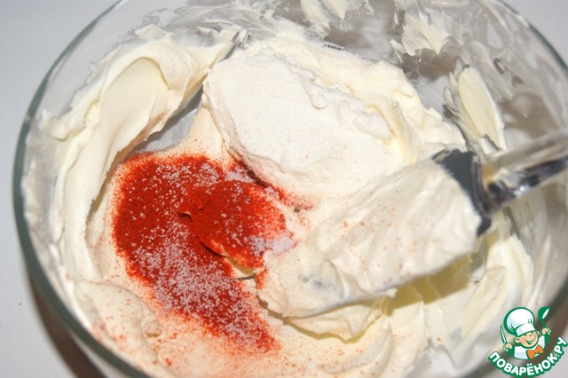Сырный крем растереть с паприкой, перцем и йогуртом. Добавить растопленный на паровой бане набухший желатин и быстро перемешать. -