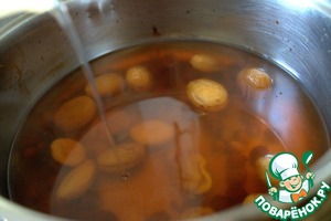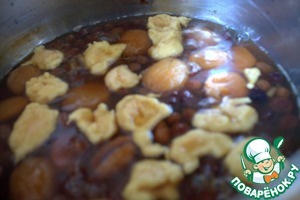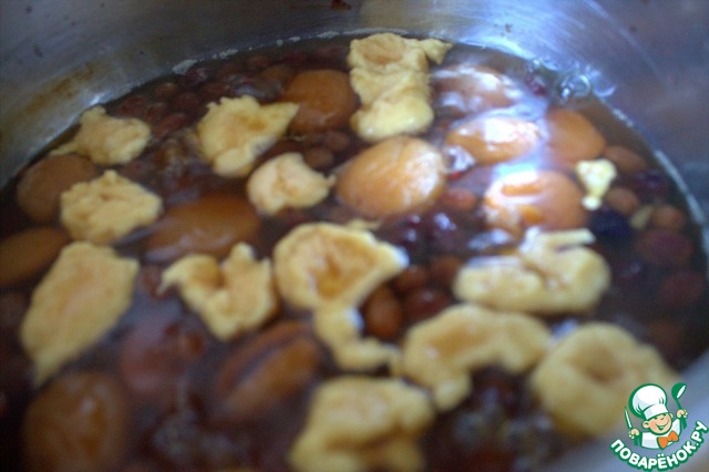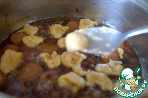 Взять на кончике ложки тесто и с помощью др. ложки отделить в нагретый компот.