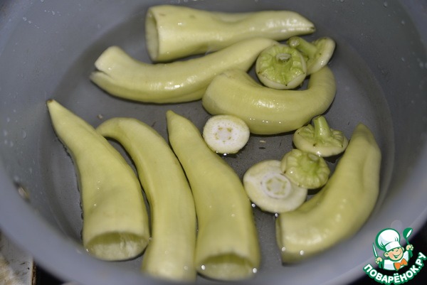 Заливаем перец водой, доводим до кипения и бланшируем около трёх минут, в оригинале 5 минут, но это будет слишком мягкий. Можно довести до мягкости в микроволновке (около 2 минут).