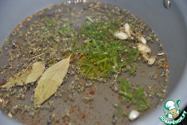 Достаём перец шумовкой и в той же воде, что бланшировали, готовим насыщенный маринад. Кладём соль, сахар, растворяем. Добавляем уксус, растительное масло, семена укропа, лавровый лист, чеснок (4 зуб.), смесь сушёных трав, смесь перцев, перец чили, стебли укропа. Конечно, это набор по желанию и возможностям. Накрываем маринад крышкой, даём ему настояться и остыть.