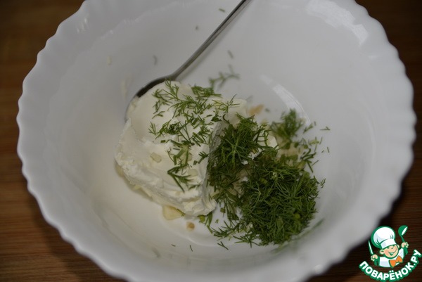 Творожный сыр смешиваем с рубленными укропом и чесноком.