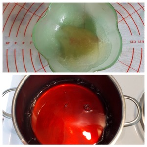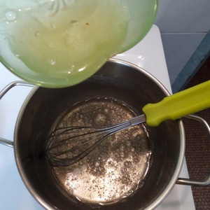 Сахар с водой нагреть постоянно размешивая, довести до кипения, отставить кастрюлю и ввести растворенный желатин.