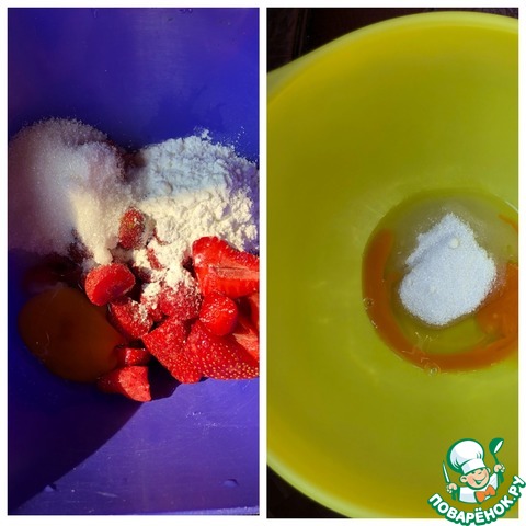 Клубнику пюрировать погружным блендером вместе с 1 яйцом, пудингом и 3 ст л сахара. Начинка готова. Для основы: 1 яйцо взбить вилочкой с 2 ст л сахара и ванилином.