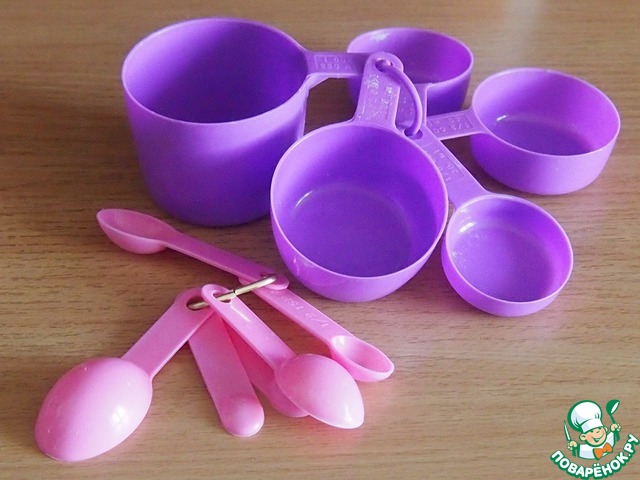 Ингредиенты для этого пирога я отмеряла стаканом объемом 250 мл. Для облегчения использую вот такие отмерки. Форма для выпекания 20 х 30 см.