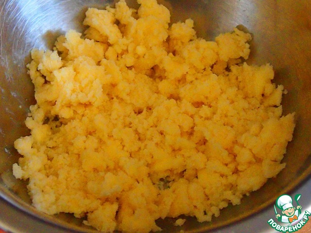 Масло распустить, добавить три четверти стакана сахара, яйца, соль. Взбить венчиком.