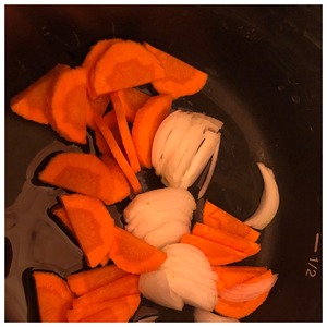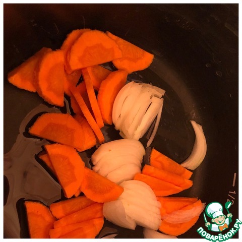 Лук и морковь нарезать полу кольцами и обжарить в чаше мультиварки на растительном масле в течение 10 минут.