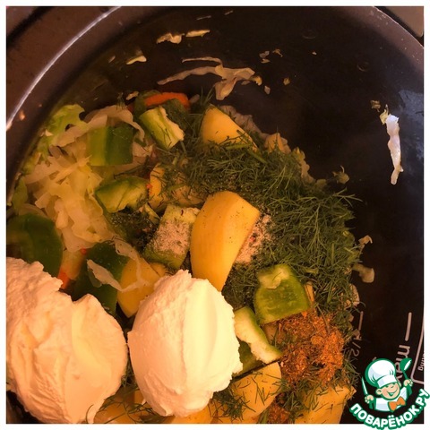 Картофель очистить и нарезать крупными дольками. Добавить к овощам вместе с солью и специями. Укроп мелко нашинковать, перец нарезать средним кубиком. Добавить сметану и пол стакана кипяченой воды. Перемешать. Закрыть крышкой, поставить режим тушения на 40 минут.