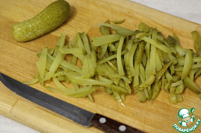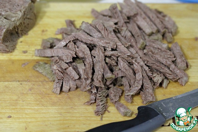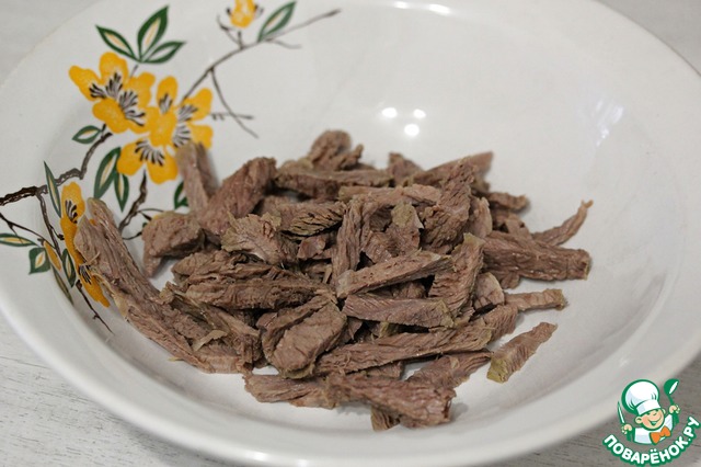 Говядину предварительно отварить в подсоленной воде, с лавровым листом и горошинами перца. Дать остыть, не вынимая из бульона.