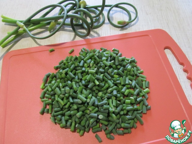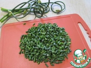 На сковороду налить 1 ложку масла и обжарить лук с чесночными стрелками до золотистого цвета лука. Затем влить пару ложек воды, убавить огонь до среднего, закрыть крышкой и тушить минут 10-15 до испарения воды. Иначе чесночные стрелки пересушатся и будут жесткими.