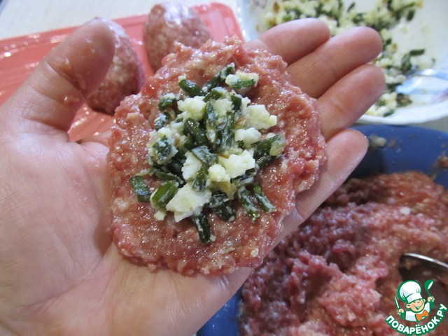 Мокрыми руками сформовать зразы, выкладывая начинку по чайной ложке (с горкой).
