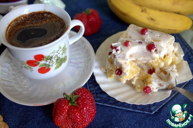 Используем банку ананасов в сиропе. Если у Вас ананасы кружочками, можно выложить их на дно вместо печенья, а печенье покрошить в основу.
