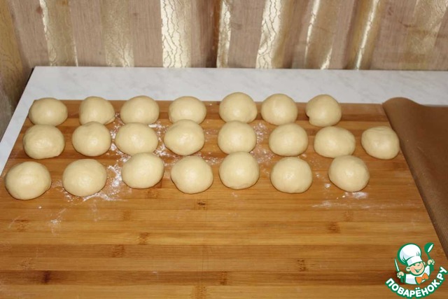 Делим на равные части. У меня получилось 22 кусочка по 60 гр. Даем отдохнуть 10-15 минут.
