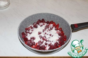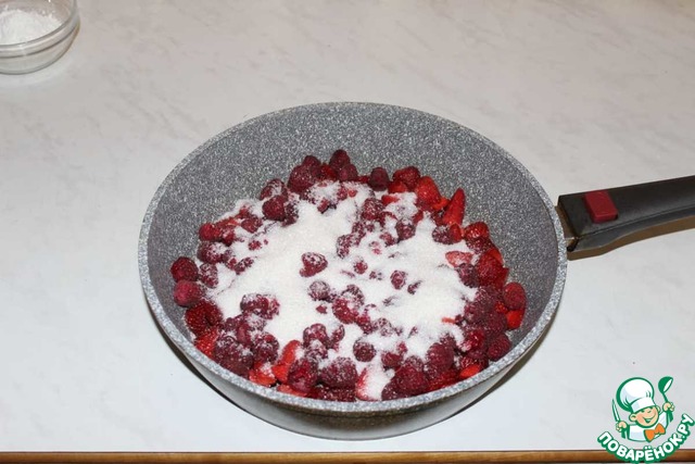 В сковородку выкладываем клубнику, малину и сахар по вкусу. Доводим до кипения, но не кипятим.