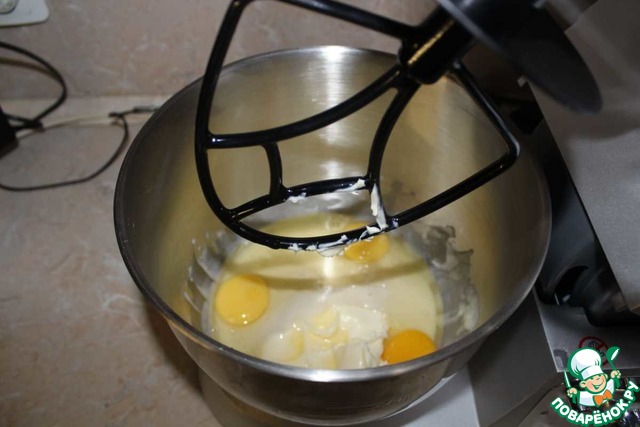 Добавляем мягкое сливочное масло, ванилин и яйца.
