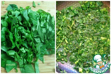 Приготовить начинку: порезать шпинат и пожарить его две – три минуты на растительном масле.
