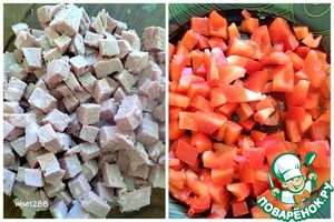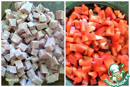 Колбасу и перец порезать кубиками.