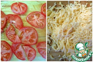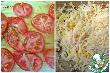 Помидоры порезать пластиками или полупластиками, сыр нашинковать.