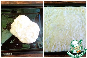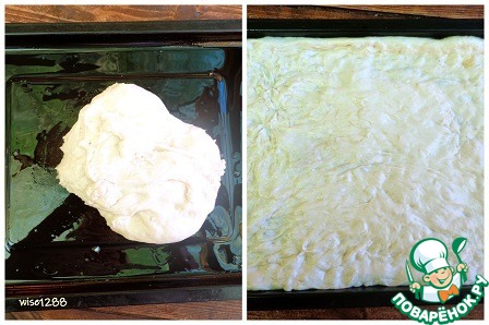 Включить духовку на 180 градусов для разогрева. Смазать противень растительным маслом, распределить по нему тесто руками.